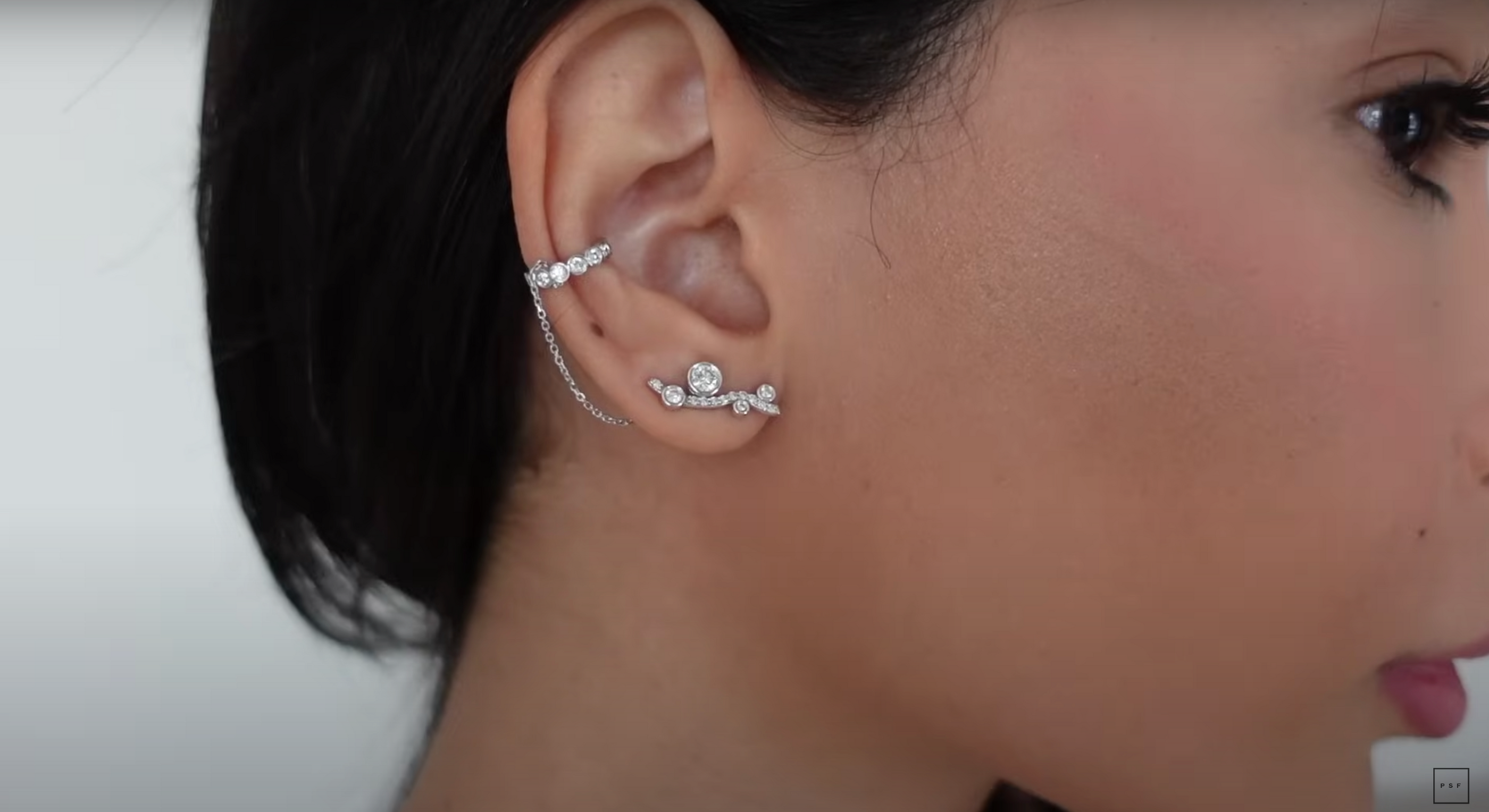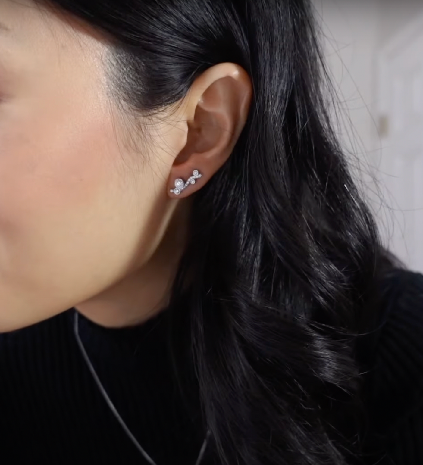 Jill caters to all the ear climber fans out there. An array of the sparkliest diamonds create a brilliant curve with each diamond capturing the light at every angle. You don't need much else when wearing this statement piece.