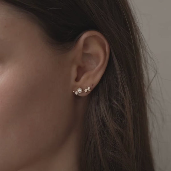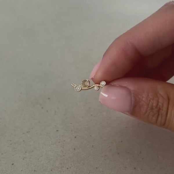 June caters to all the ear climber fans out there. A solid gold branch creates a brilliant curve with a few diamonds diamonds capturing the light at every angle. You don't need much else when wearing this statement piece.